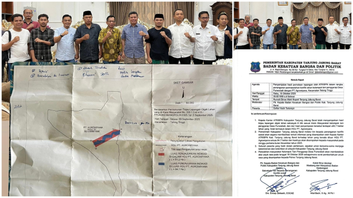 Tanjung Jabung Barat – Pemerintah Kabupaten Tanjung Jabung Barat melalui Badan Kesatuan Bangsa dan Politik (Kesbangpol) menggelar rapat koordinasi bersama Kantor ATR/BPN Tanjung Jabung Barat dan sejumlah pihak terkait, Rabu malam (15/10/2025), di Rumah Dinas Wakil Bupati Tanjung Jabung Barat. Rapat tersebut membahas hasil pemetaan lapangan oleh ATR/BPN terkait konflik lahan antara kelompok tani penggarap Desa Purwodadi dengan PT. Agrowiyana di Kecamatan Tebing Tinggi.