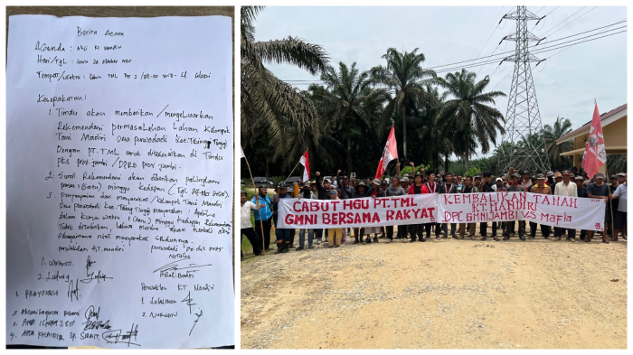 Kelompok Tani Mandiri dan Dewan Pimpinan Cabang Gerakan Mahasiswa Nasional Indonesia (DPC GMNI) Jambi melakukan aksi diarea kebun yang diklaim milik PT. Tri Mitra Lestari pada senin, (20 Oktober 2025).