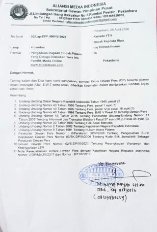 Uji Undang-Undang Pers, Teva Iris Wajib Dilaporkan ke Mapolda Riau