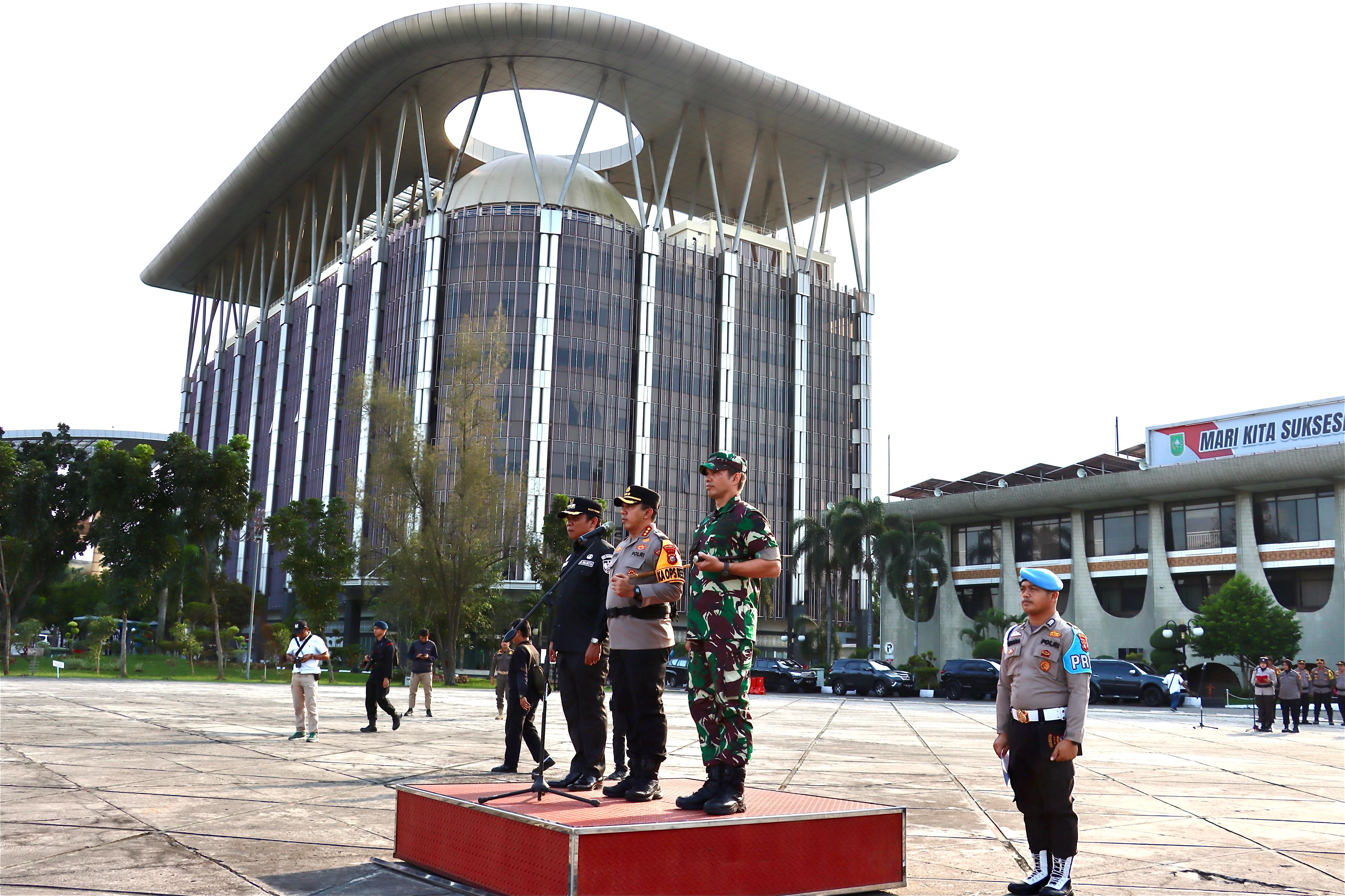 Kegiatan tersebut dihadiri oleh berbagai tokoh penting, termasuk Pj. Walikota Pekanbaru, Muflihun, S.STP., M.AP, Dandim 031 serta para pimpinan instansi terkait lainnya. Mereka turut menyaksikan prosesi pemeriksaan pasukan yang dilakukan sebagai bagian dari persiapan pengamanan TPS pada hari pemungutan suara nanti.