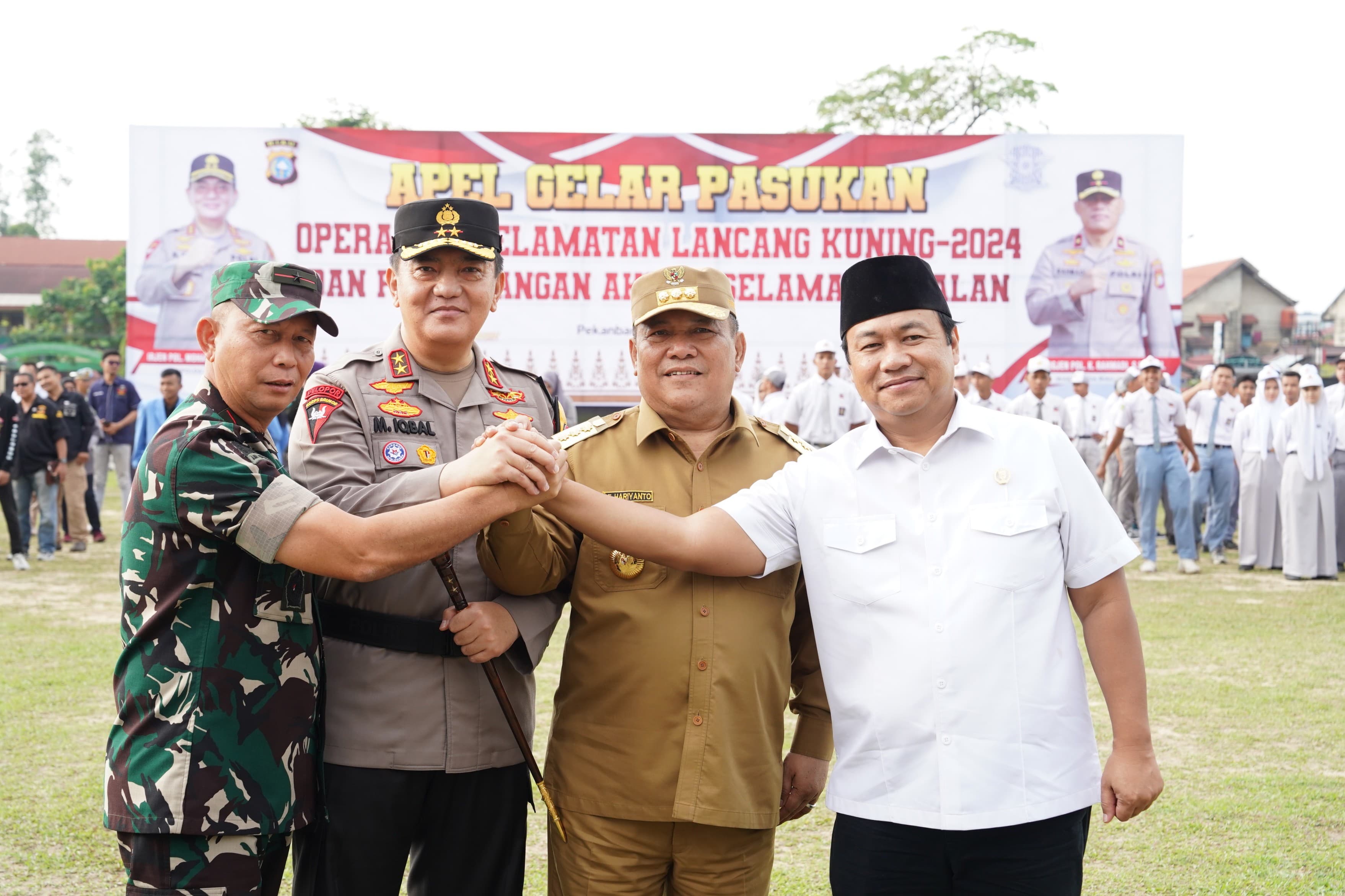 Pekanbaru - Polda Riau menggelar apel gelar pasukan Operasi Keselamatan Lancang Kuning 2024 dan Pencanangan Aksi Keselamatan Jalan, di halaman depan Mapolda Riau, Jalan Pattimura, Kota Pekanbaru, Sabtu (2/3/2024).