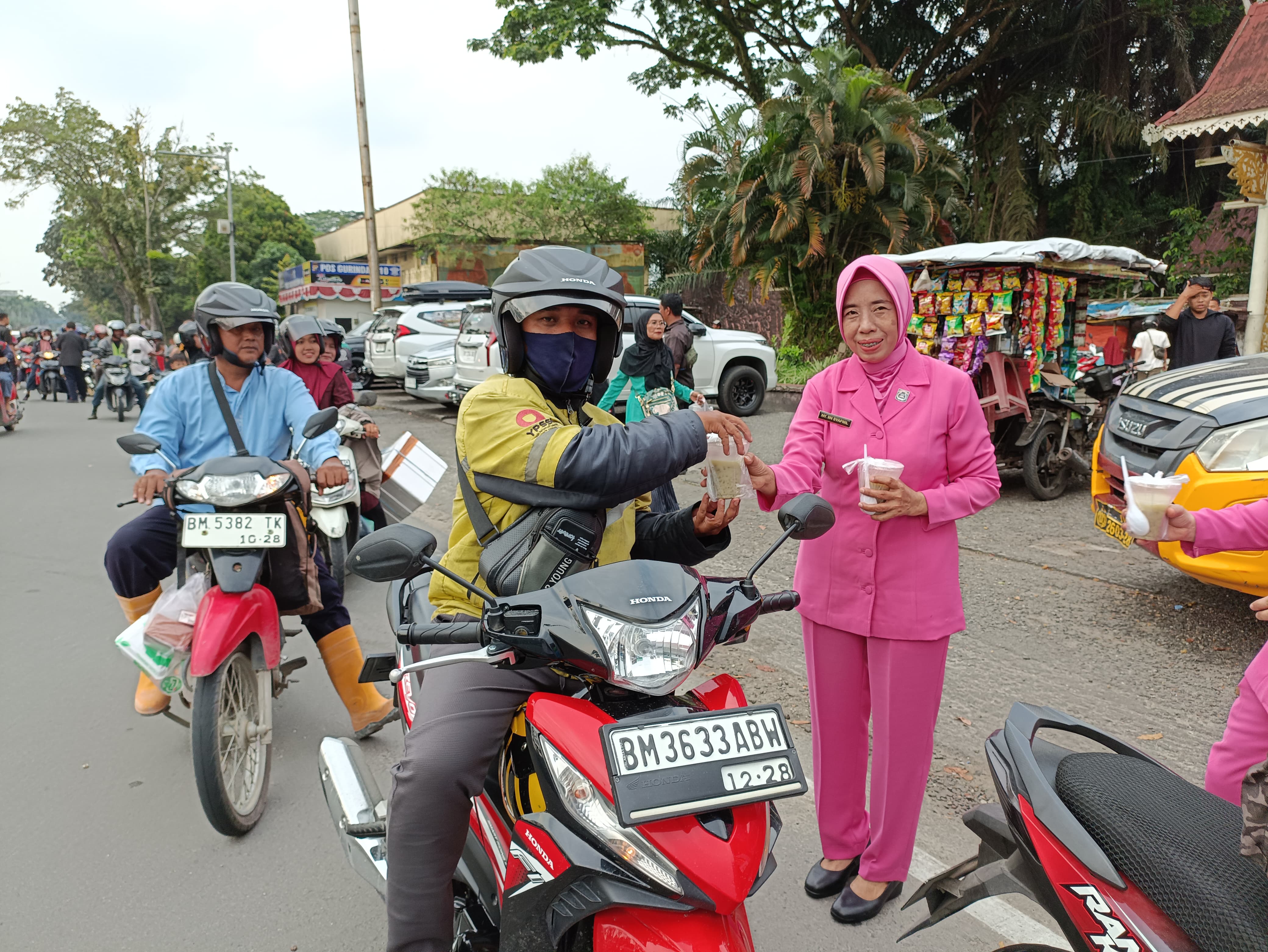 Kapolsek Bukit Raya dan Ketua Bhayangkari Ranting Bukit Raya Bagi-Bagi Takjil Gratis ke Pengendara Jalan.