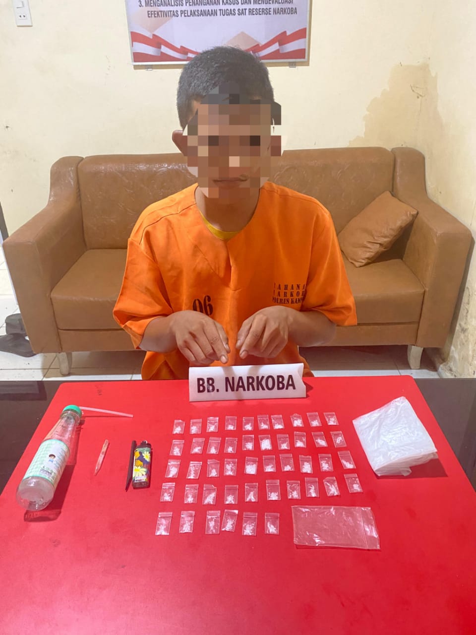 Selanjutnya dilakukan penggeledahan yang disaksikan oleh Perangkat Desa Setempat ditemukan 46 (Empat Puluh Enam) Paket diduga Narkotika jenis Shabu yang dibungkus dengan plastik bening didalam plastik pembungkus warna putih di tangan sebelah kiri pelaku MI (27).