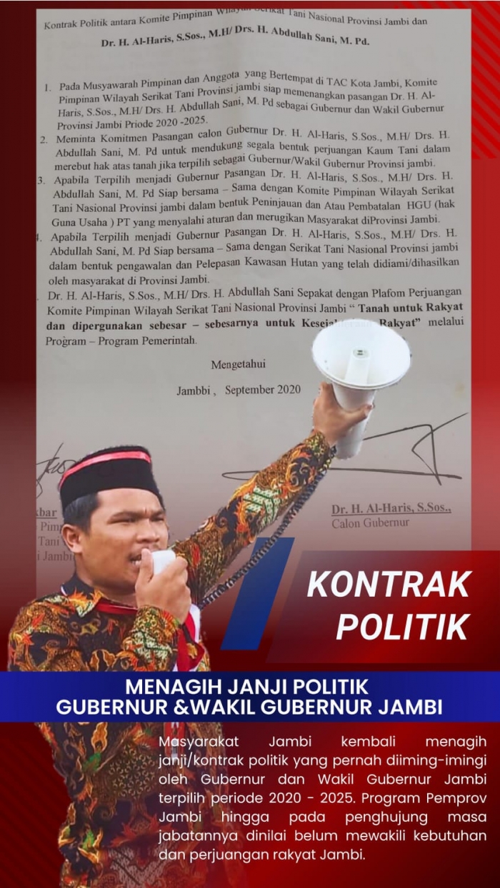 Menyambut Hari Tani Nasional Selasa, 24 September 2024 adalah hari mengingatkan kita kembali bahwa perjuangan golongan petani hingga pembebasan mereka dari kesengsaraan masih berlanjut. Jambi sendiri menduduki posisi ke-3 konflik agraria tertinggi di Indonesia sehingga para Calon kepala Daerah di Provinsi Jambi harus memiliki cara yang lebih kompleks dalam menekan angka konflik agraria di Jambi karena di Jambi sendiri persoalan agraria adalah persoalan hidup matinya rakyat.