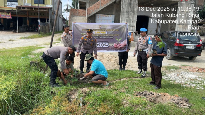 TAMBANG - Dalam rangka mendukung Program Kapolda Riau tentang Green Policing, Polsek Tambang melaksanakan kegiatan tebar kepedulian lewat penanaman bibit pohon di hari pohon sedunia dalam menyambut Natal dan Tahun Baru ( Naturu) 2025, Kamis (18/12/2025).